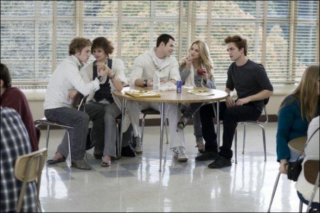 Dans le livre ils se sont vues la 1ière fois dans la cantine et dans le film aussi, à part que dans le livre Edward est déjà assi à sa table avec les autres. Dans le film il arrive et s'assoit.