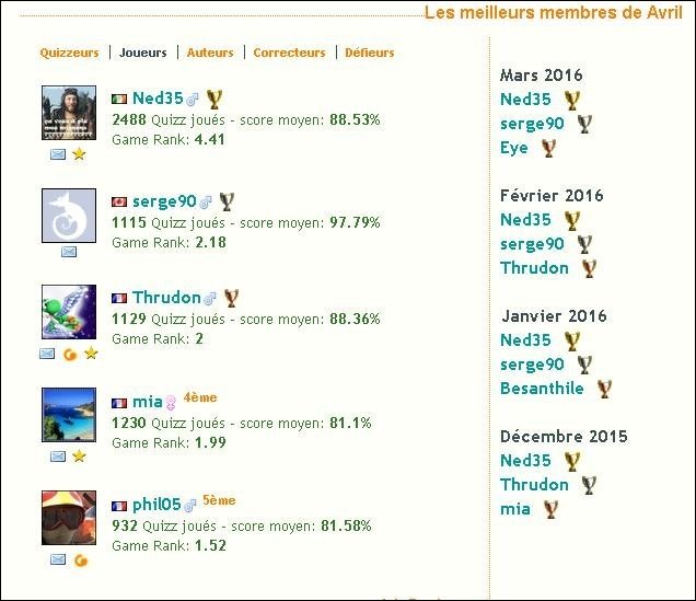 Jouez comme vous le souhaitez, ça ne me pose aucun problème, je ne suis pas une "acharnée" des défis, radiz, etc... Néanmoins je ne peux m'empêcher de constater que ce mois ci, ma moyenne de quiz réussis est de 81 %, j'ai fait une bonne centaine de quiz de plus que vous, toutes mes réponses sont le fruit de mes connaissances (et parfois un peu le fruit du hasard) et je suis à la 4e place du classement, alors que vous vous situez à la 2eme. Cherchez l'erreur...