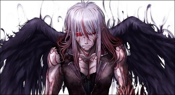 Des flux d’énergies rouges recouvrirent son corps. Ses yeux s’injectèrent de sang jusqu’a ce qu’ils deviennent entierement rouges. Sa peau se colora d’un gris sombre. Ses canines devinrent légèrement plus longues. Ses cheveux blancs s’allongèrent et se tintèrent de reflets rouges. Pour finir, des marques rouges apparurent sur tout son corps. Ses ailes noires étaient toujours présentes dans son dos.