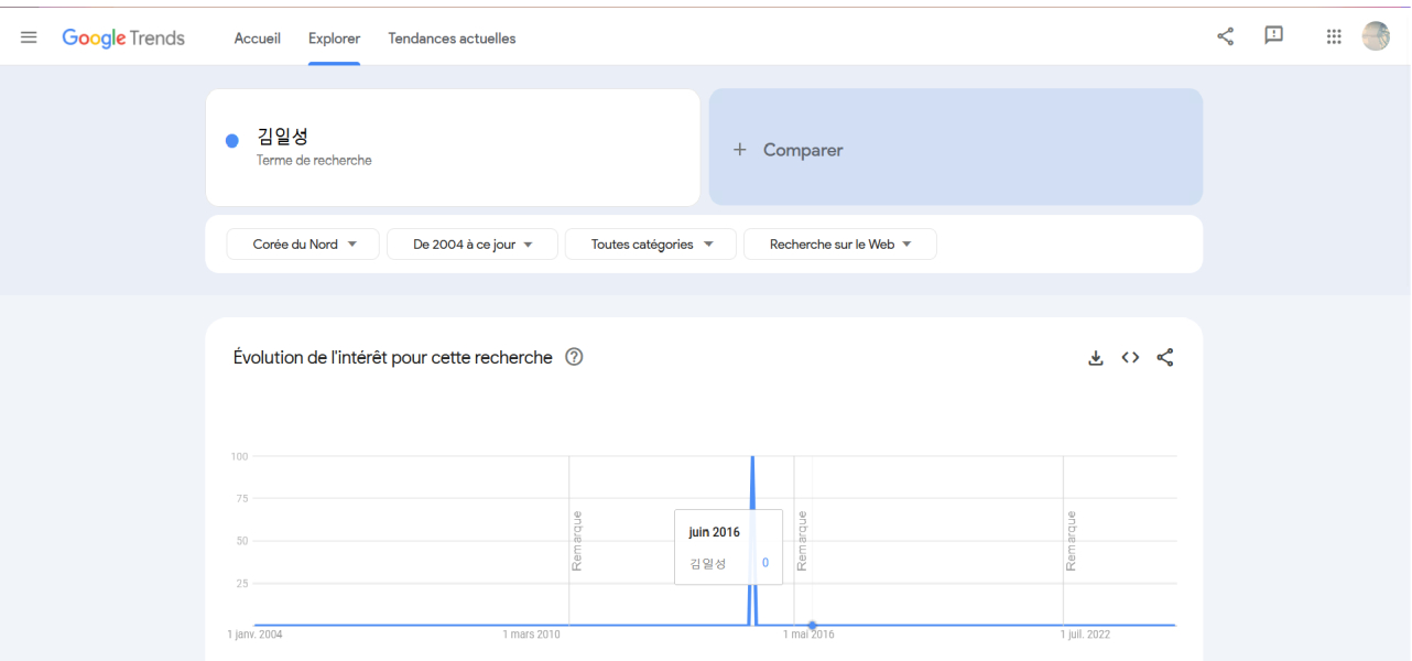 J'ai tapé "Kim Il-sung en coréen, et j'ai filtré pour voir les recherches en Corée du Nord. Vous me direz que ce n'est pas possible car Internet est interdit là-bas, eh bien regardez ce que j'ai obtenu
